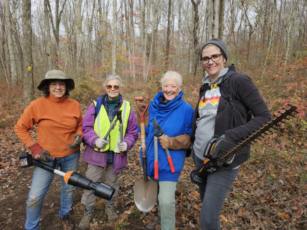 For clearing the trails it is helpful to have one person removing sticks and a second person leaf blowing. For invasive removal bring loppers and digging tools.